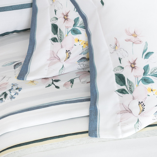 Os jogos de cama da coleção Bud Vision são produzidos em tecido cetim 100% algodão, 300 fios, fio penteado com toque acetinado, macio e super confortável. Acabamento de excelente qualidade e design Buddemeyer. O composê de listras e florais em cores leves traduz o frescor do verão a esta coleção. A sobreposição de tons em efeito aquarelado entrega transparênscia e delicadeza ao desenho. O acabamento se dá pela moldura criada nas fronhas e vira do sobrelençol. Kit composto por sobrelençol com dobra feita e estampa localizada na vira, lençol com elástico na cor branca para altura de colchão com 35cm e fronhas 3 abas com estampa localizada. Perfeito para vestir sua cama com qualidade e estilo!